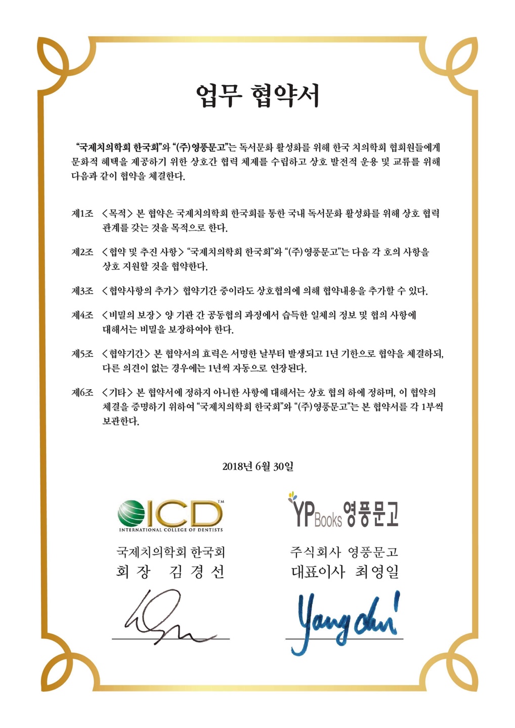 (주)영풍문고와 업무협약을 통해 한국 치의학회 협회원들에게 문화적 혜택을 제공하기 위한 상호간 협력 체제를 수립하고 상호 발전적 운용 및 교류를 하기로 했습니다.