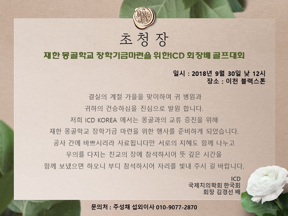 일시 : 2018년 9월 30일 낮12시 장소 : 이천 블랙스톤 결실의 계절 가을을 맞이하여 귀 병원과 귀하의 건승하심을 진심으로 발원 합니다. 저희 ICD KOREA 에서는 몽골과의 교류 증진을 위해 재한 몽골학교 장학기금 마련을 위한 행사를 준비하게 되었습니다. ICD 국제치의학회 한국회 회장 김경선 배상