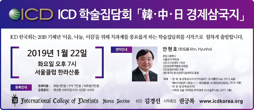 2018년 첫 ICD 학술집담회 "한중일 경제 삼국지"를 1월22일 개최합니다. 일시 : 2019년 1월 22일 화요일 오후7시 장소 : 서울클럽 한라산룸
