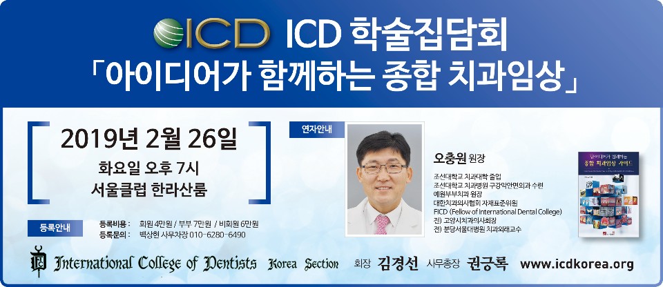 | 제목 | 2019 ICD 학술집담회 '아이디어가 함께하는 종합 치과임상' 가 개최됩니다. |
